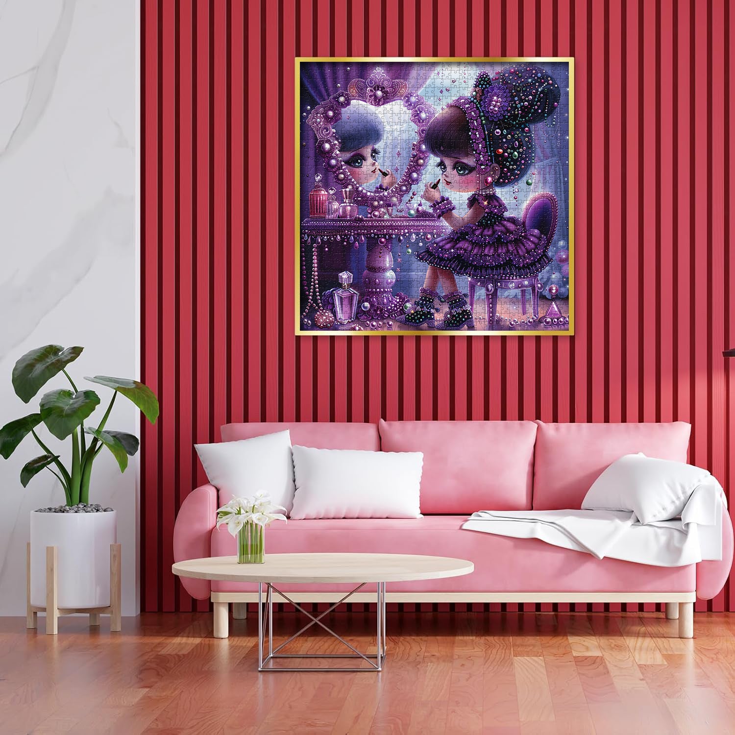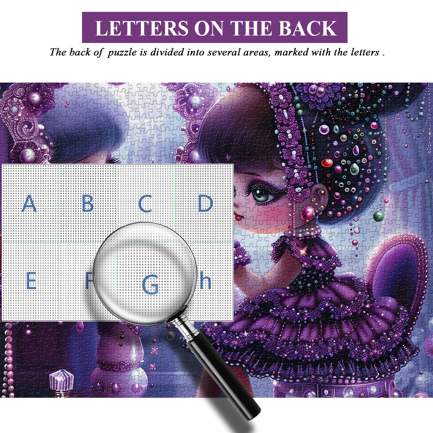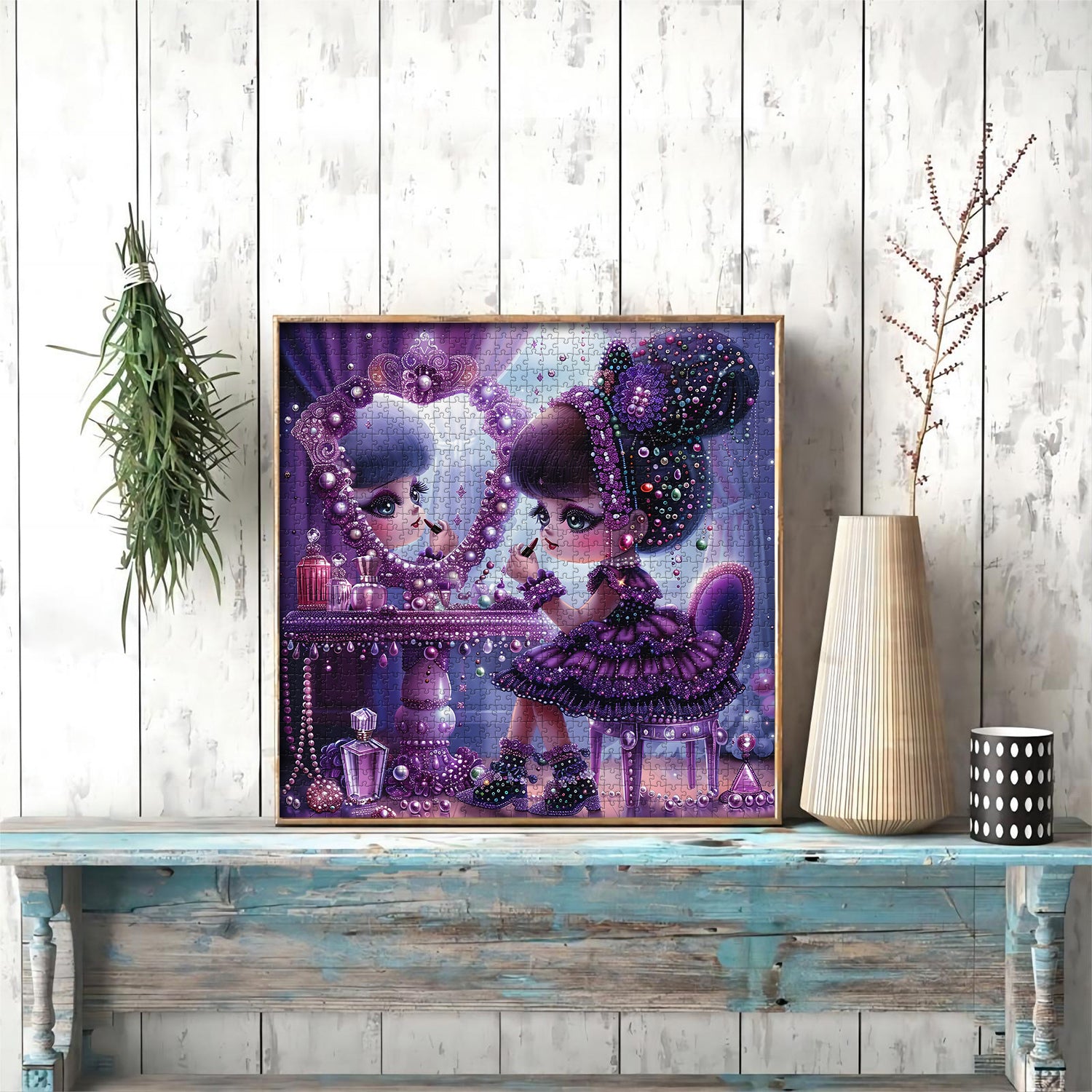 👸👑【Il paese dei sogni delle fiabe】Questo puzzle raffigura un mondo da favola da sogno, in cui una principessa si traveste davanti a una toletta decorata, piena di giocosità e immaginazione infantile. Vestita con uno splendido abito viola e una corona abbagliante, la principessa trasuda nobiltà ed eleganza reali.👗🌈